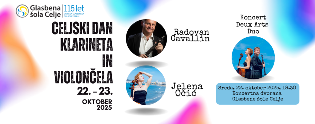 Obveščamo vas, da Glasbena šola Celje v okviru CELJSKIH DNEVOV organizira dvodnevni seminar za klarinet in violončelo, ki bo potekal 22. in 23. oktobra 2025. Seminar bosta vodila priznana umetnika Radovan Cavallin (klarinet) in Jelena Očić (violončelo), ki sicer tudi nastopata kot Deux Arts Duo.