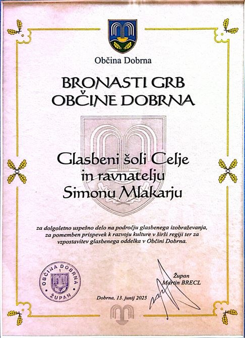 Glasbena šola Celje je ob občinskem prazniku Občine Dobrna prejela bronasti grb Občine Dobrna. Priznanje je bilo podeljeno za dolgoletno uspešno delo na področju glasbenega izobraževanja, za pomemben prispevek k razvoju kulture v širši regiji ter za vzpostavitev glasbenega oddelka v Občini Dobrna. Kulturni program je pripadel Simfoničnemu orkestru Glasbene šole Celje pod umetniškim vodstvom Matjaža Brežnika, ki je skupaj s solisti ustvaril nepozaben glasbeni program.