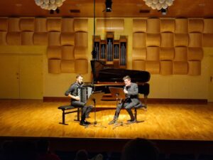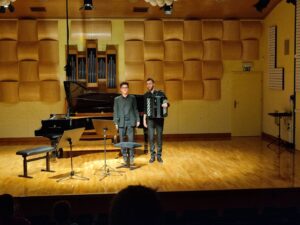 V ponedeljek, 24. 10. 2022, sta se v okviru novega cikla koncertov HARMONIKA+, ki služi k večji promociji harmonike v celjskem prostoru, učencem, njihovim staršem in učiteljem Glasbene šole Celje predstavila mlada glasbenika, harmonikar Andrej Kos in klarinetist Filip Brezovšek. Andrej je diplomant Visoke šole za glasbo in upodabljajočo umetnost v Gradcu in od letošnjega šolskega leta tudi učitelj harmonike na naši osnovni ter srednji stopnji, Filip je nekdanji učenec in dijak Glasbene šole Celje in I. gimnazije v Celju, trenutno pa študent salzburške in graške Visoke šole za glasbo, kjer se ukvarja tako s klasično kot jazzovsko glasbo, ter član več tujih orkestrov in žanrsko raznovrstnih zasedb. Poslušalcem sta tokrat ponudila zelo pisan program z deli Johanna Sebastiana Bacha, z deli jazzovsko obarvane zabavne glasbe (A. Murena, C. Bakanič) in z avtorskima priredbama slovenskih ljudskih pesmi. Koncert je ob primernem programu in doživeti izvedbi minil kar prehitro. Upamo, da ju kmalu spet slišimo na našem odru.