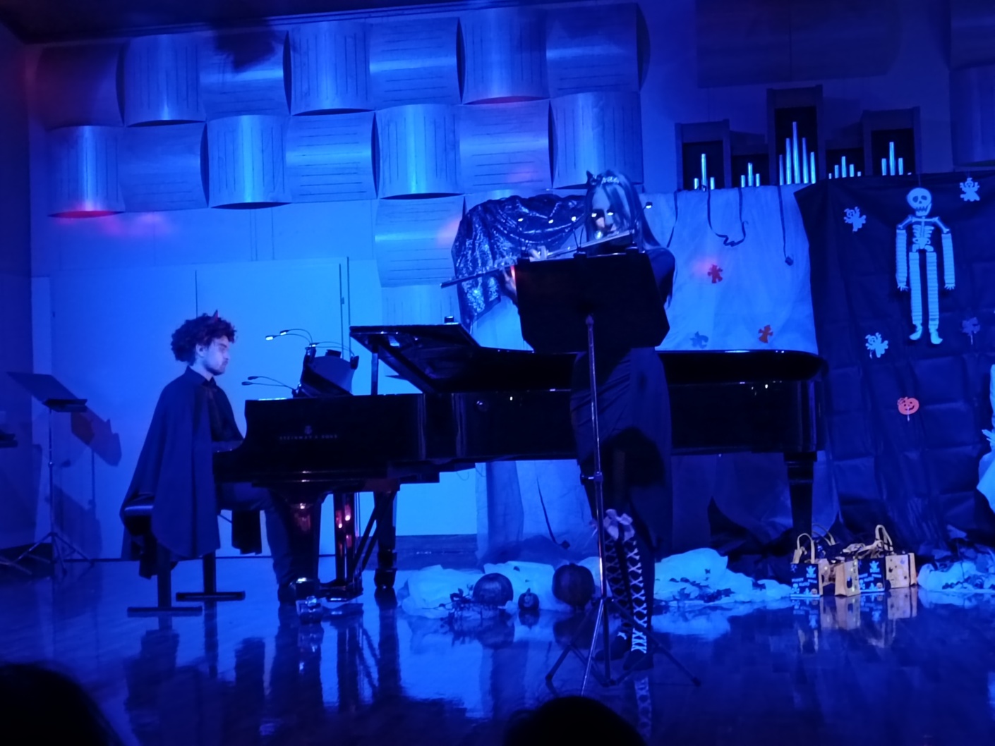 Oddelek pihal je v ponedeljek, 23. oktobra, pripravil prav poseben tematski večer, ki je občinstvo prepričal z dobro glasbo in izvirno, strašljivo odrsko sceno. “Strašljivke, zgodbe iz omare” so navdušile do zadnjega kotička napolnjeno Koncertno dvorano Glasbene šole Celje. Okostnjaki, pajki, čarovnice in čarobne buče so dopolnile skrivnostno osvetljavo odra, mladi glasbeniki pa so svoje glasbene zgodbe pripovedovali ob prihodih iz čarobne omare. Brez težav lahko rečemo, da so nam tokrat zavidale tudi “prave čarovnice”.